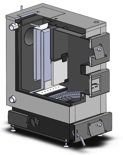 Ruszta wodne pod specjalnym kątem umożliwiają spadanie popiołu do popielnicy, jednocześnie zapewniając doskonały dostęp powietrza do procesu spalania. Panele ceramiczne izolują komorę spalania, utrzymując wysoką temperaturę niezbędną do efektywnego spalania ekogroszku. Wymiennik ciepła pułkowy (przegrodowy) zbiera ciepło ze spalin i przekazuje je do wody grzewczej. Zawirowywacz płomieni pędziszy spaliny wokół całej objętości wymiennika, zapewniając maksymalny kontakt i efektywność wymiany ciepła.