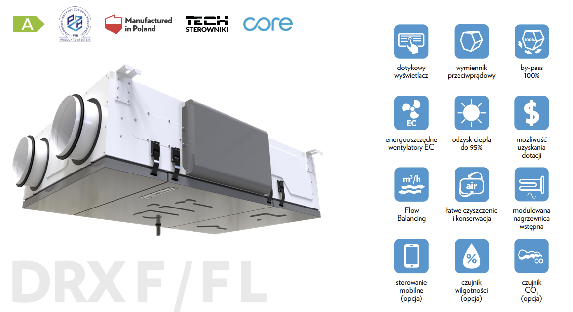 🔹 Wymiennik przeciwprądowy marki Recair – zapewnia wysoką sprawność odzysku ciepła, co przekłada się na niższe koszty ogrzewania.